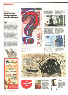 Continue readingIn a feature relating to Greece leaving the Euro to return to the Drachma the Guardian newspaper asked me to do customise a 5 Euro note to act in transition. Here’s my effort and the caption to go with it. ‘Achilles and that damned heel of his. He’s holding on his spear the letter omega, […]