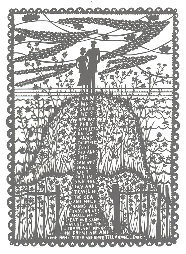 ‘Can We? Shall We? One day very soon, let us go away together just you and me. Can We? Shall We? Call in sick one day and travel to the sea and hold hands all day. Can We? Shall We? Eat our sandwiches on the train, get drunk on fresh air and come home tired and never tell anyone…. Ever.’