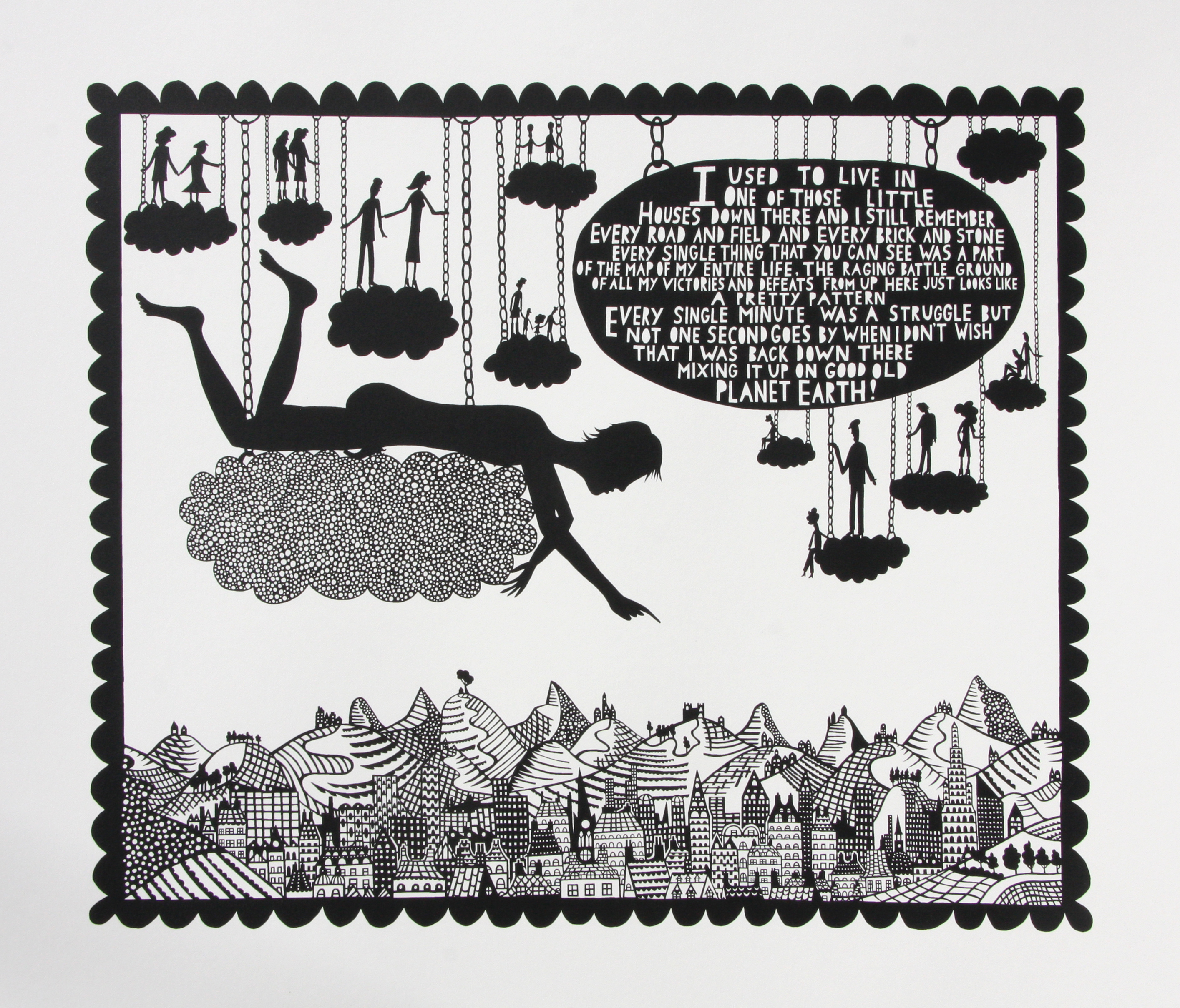 ‘I used to live in one of those little houses down there and I still remember every road and every field and every brick and stone. Everything you can see was the map of my entire life. The raging battleground of all my victories and defeats, from up here just looks like a pretty pattern. Every single minute was a struggle but not a second goes by when I don’t wish I was back down there… mixing it up again on good old planet earth.’